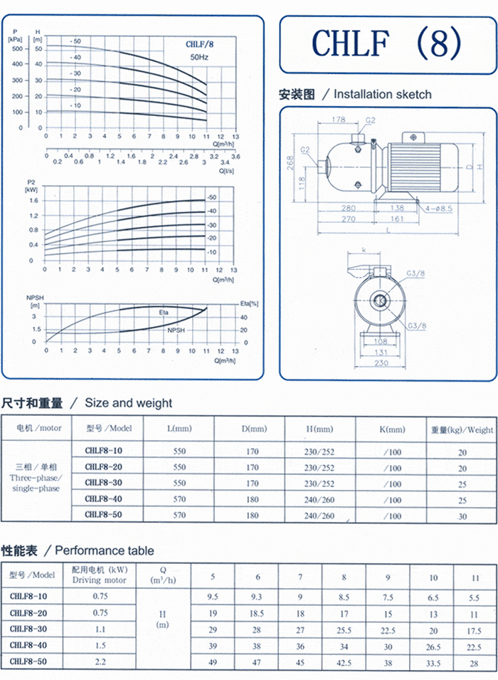 CHL,CHLK和CHLF(T)輕型臥式多級離心泵采用了免修機械密封。泵的過流部件均采用不銹鋼材料(304或316)制成,具有低噪音,耐輕腐蝕,外形美觀、體積小、重量輕、使用壽命長等特點。